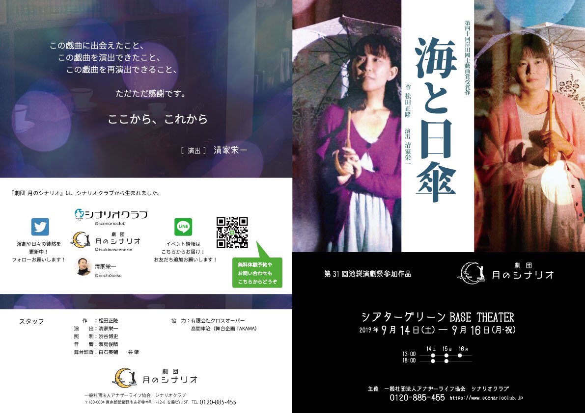 こちらが、最新。 シナリオクラブの劇団 月のシナリオ。 令和元年 9月 「海と日傘」 池袋演劇祭に初挑戦です。 清家さんの言葉。 ここから これから https://t.co/BsC0xJk23C