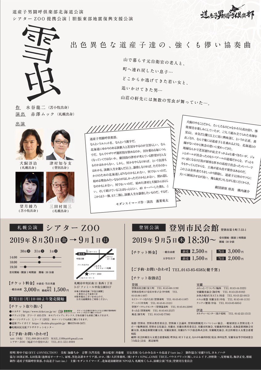 本日初日の道産子男闘呼倶楽部「雪虫」。 シアターZOOのホームページで、当日券情報発表。 昨夜の時点で、本日の前売り券完売。 若干枚数の当日券を発売予定。 明日以降も予約が殺到中。 お急ぎください。… https://t.co/iKcvAPemPa