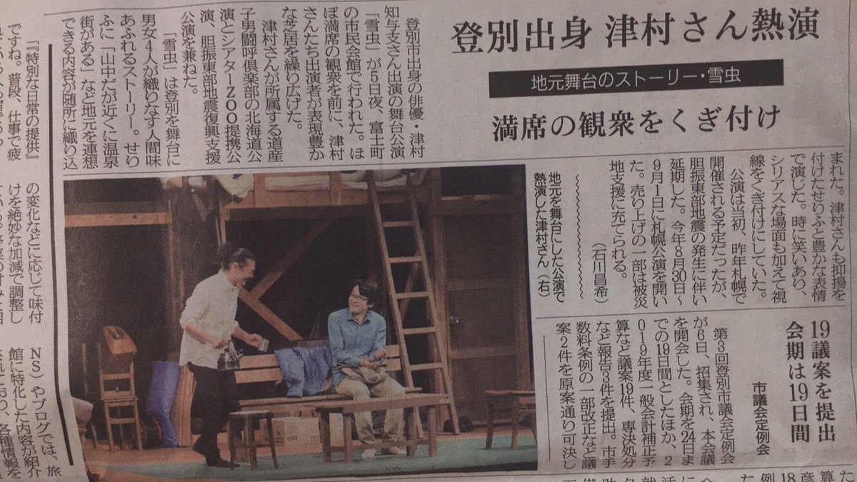 道産子男闘呼倶楽部「雪虫」北海道公演のインタビュー記事が今朝の北海道新聞室蘭胆振のページに掲載されました! そして、今日の通し稽古に札幌から上京していた小島達子さんが来てくれました! 犬飼部長と同級生の達子さん。 札幌公演は、この… https://t.co/UZtceF8JJN