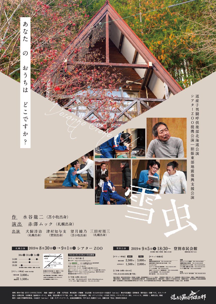 | スタッフ | 照明:野中千絵(RYU CONNECTION) 美術:加藤ちか 音響:久門美佑 舞台監督:斉藤健 宣伝美術:むらかみなお+小島達子(tatt inc.) 舞台写真撮影:星野麻美 制作協力:室蘭VOX・ヨルノハテ 主催:モダンスイマーズ、北海道演劇財団、NPO法人札幌座くらぶ 企画制作:道産子男闘呼倶楽部、小島達子(tatt inc.) |