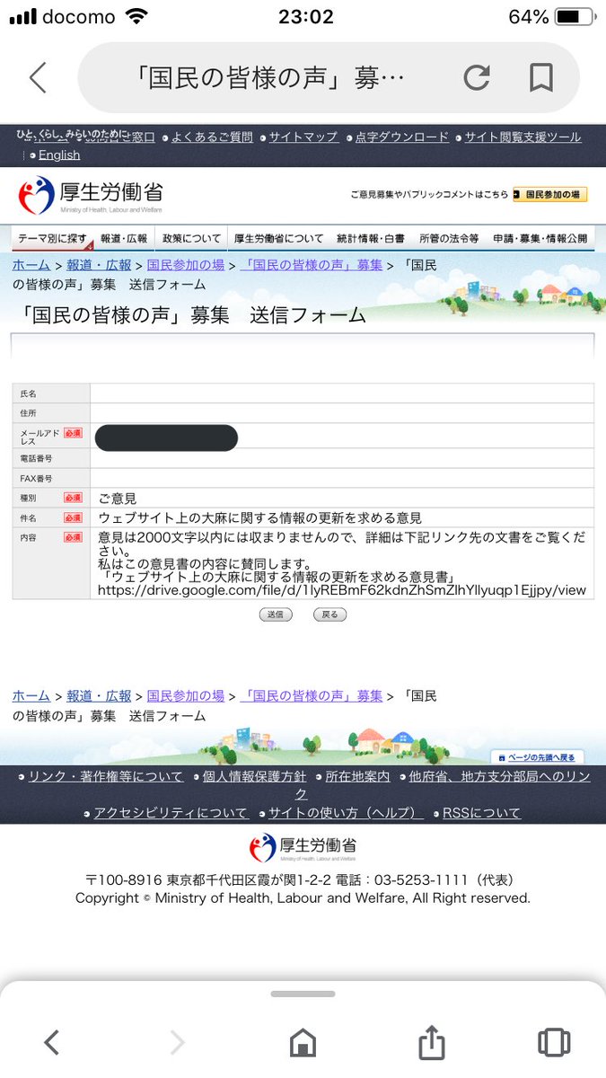 39. 今こんなのがあるのを知って、厚労省にメールしました。 自分には関係無いじゃなくて、1人1人が小さな事でもアクション起こさないと、この国は変わらないないよ? 自分が住んでる国の話だからね? https://t.co/0WTDRQipp3 #厚労省大麻情報更新