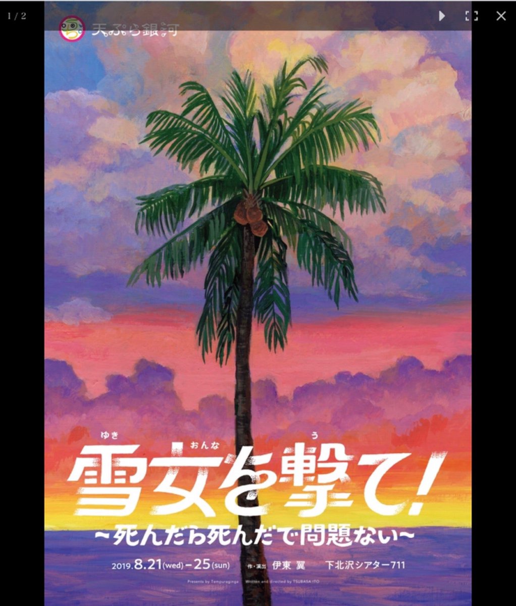 先日 天ぷら銀河さん「雪女を撃て!」の観劇に行って参りました。 わたし、大好きなんだと思います。天ぷら銀河さんのつくる世界も、言葉も。 あんなにも肩肘はらずに世界に誘われて。夢のような時間。にやにやしました。すんごいおもしろか… https://t.co/L3txPQfCjl