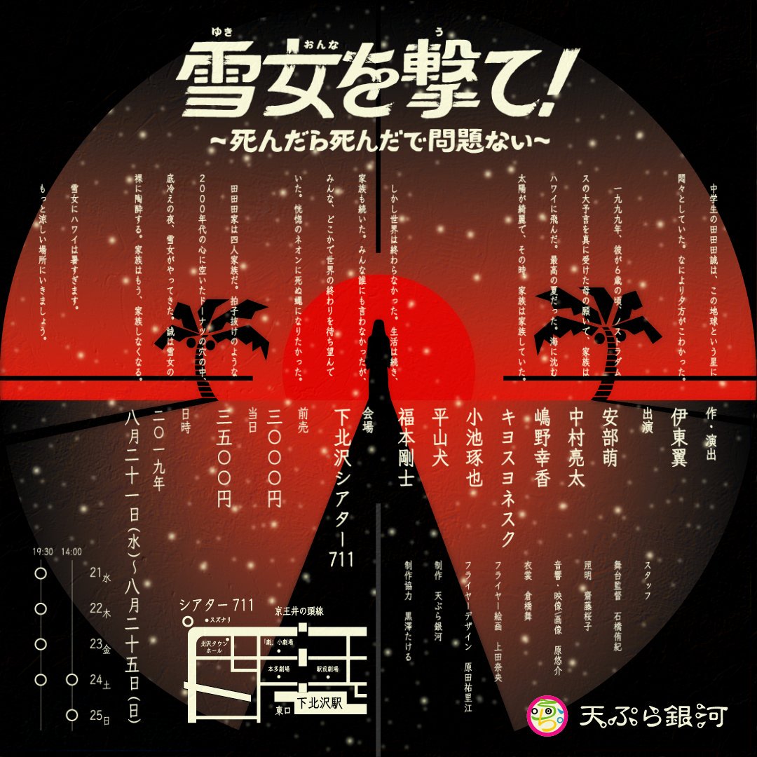 天ぷら銀河『雪女を撃て!〜死んだら死んだで問題ない〜』本日もご来場、誠にありがとうございました! 明日の24日(土)は、 14:00 / 19:30 の二回公演です! ◇上演時間は110分予定。 ◇当日券ございます。 ◇予約受… https://t.co/mZwQq4xnFB