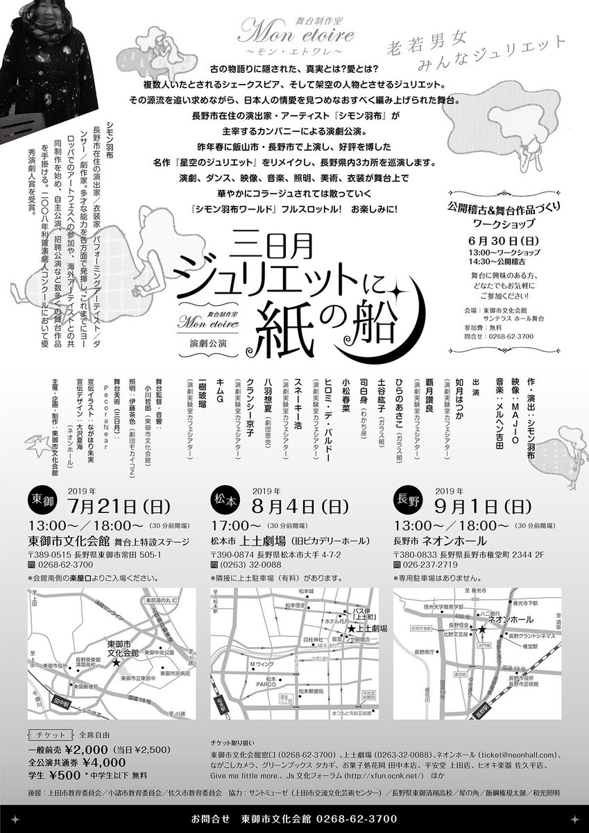 | スタッフ | 映像:MAJIO 音楽制作・音響:メルヘン吉田 舞台監督・音響:小川哲郎(東御市文化会館) 照明:伊藤茶色(劇団モカイコZ) 舞台美術(三日月):PecoraNear 宣伝イラスト:ながはり朱実 大沢夏海(ネオンホール) 主催・企画・制作:東御市文化会館 |