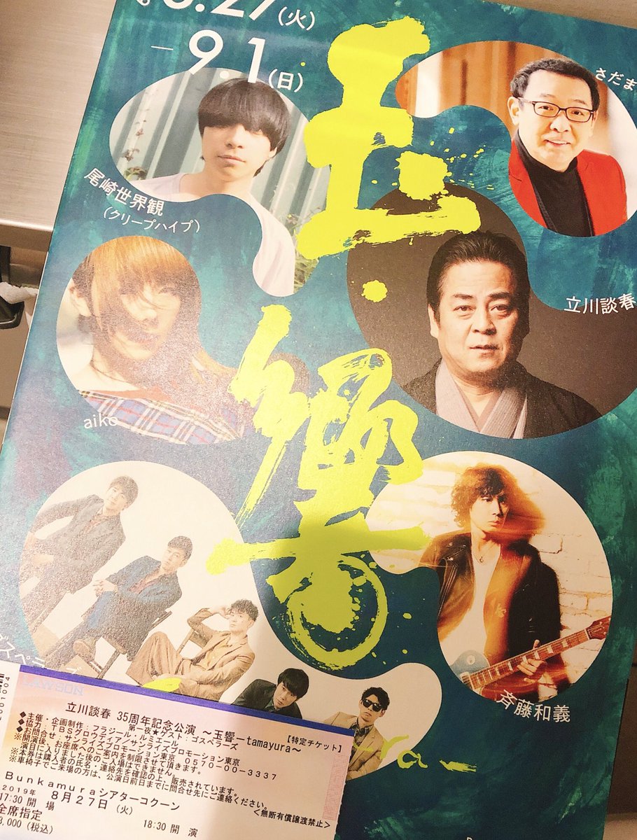 2019年8月28日【水】立川談春35周年記念公演~玉響-tamayura 開演18時半 シアターコクーン 渋谷 に来ました 番の組 桑名船 談春/二人は中っ腹、なおはなし/ライブ 尾崎世界観/らくだ 談春/アンサーソング 尾崎世… https://t.co/WiaIMpGWFZ