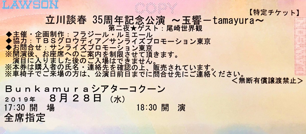 ☘️同行者募集☘️ aikoの日。 立川談春35周年記念公演~玉響-tamayura~ 2019/8/30(金) 18:30 開演 チケット:定価+手数料/当日会場手渡 席種:1階後方(売止席)/30代眼鏡男子隣 あまり慣れ… https://t.co/FHCkGbSlAc