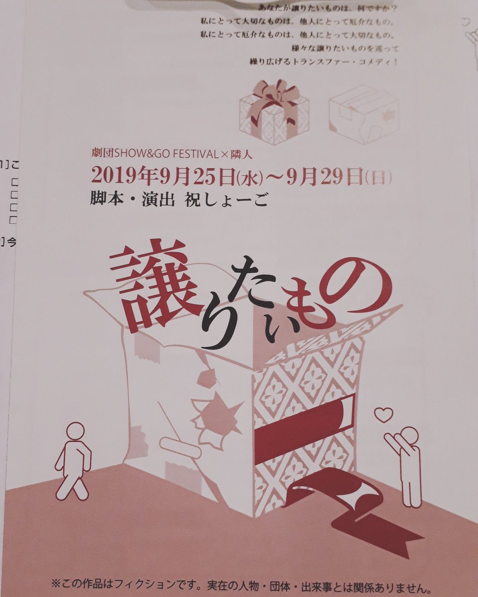 劇団SHOW&GO FESTIVAL×隣人 「譲りたいもの」観劇致しましたー! コメディとしてレベルが高く面白かったです😊 1人1人キャラクターがしっかりしていたので、最後まで楽しく見ることが出来ましたっ! 明日が千穐楽みたいです😌 最後まで頑張って下さい💪