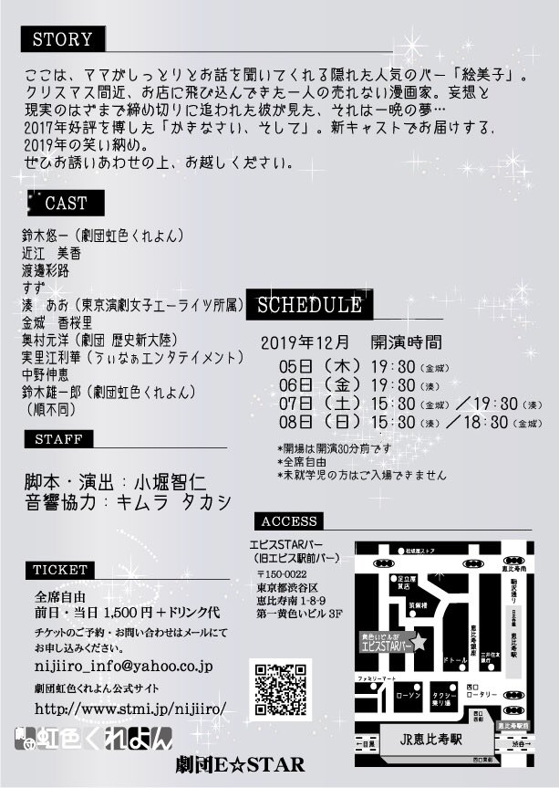 そして今日は黒田さんにお誘い頂きお稽古終わりにこちらを観劇🗣💓 E☆STAR 12月公演 「かきなさい、そして」@エビスSTARバー このお値段でこのクオリティ🙄!? 良いんですか!?っていうくらい凄く面白く素敵でした😭💓近距… https://t.co/08yg8a3End