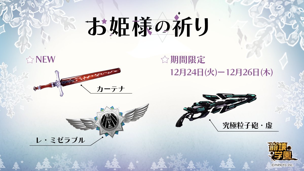 37. 【お姫様の祈り】 https://t.co/OLDpLO8NFe 新装備「カーテナ」「レ・ミゼラブル」追加! 期間:12/20(金)12:00~12/27(金)12:00 詳細はゲーム内でご確認ください。 https://t.co/JdjAOiFT6C #崩壊学園