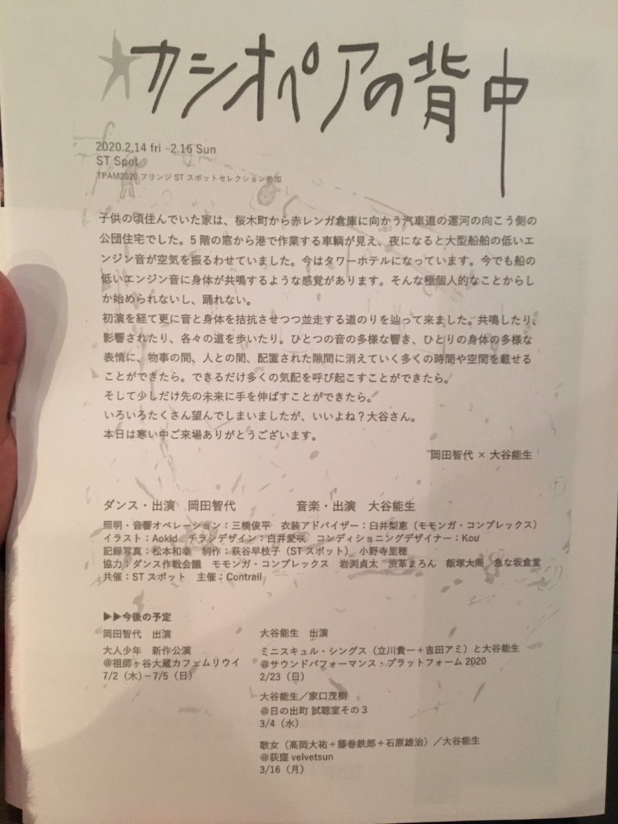 『カシオペアの背中』無事終演致しました。 ご来場いただいた皆さま、気にかけていただいた方々、支えてくれたスタッフ、ありがとうございました。 大谷さんとは音楽とダンスがガッツリ組み合うようなことを即興ではなくやりたくて、ギリギリま… https://t.co/TNqXHRlEKK