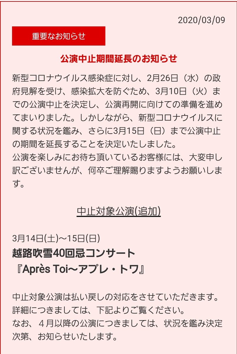 【公演中止期間延長のお知らせ】 https://t.co/b8ydJzM3xe 3月15日(日)まで公演中止の期間を延長することが決定いたしました。お客様に大変ご迷惑おかけしますことを心よりお詫び申し上げます。 <中止対象公演>3… https://t.co/NFy7O4u4Ps