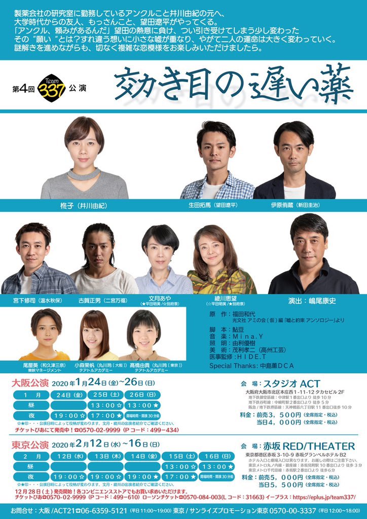 「効き目の遅い薬」 さん原作の切ないミステリー。 これまでとは一味違うteam337を是非ご覧下さいませ。 東京公演まであと3日。 チケット絶賛発売中です。 詳細はhttps://t.co/GsAi9rMsuQへ。 https://t.co/oPJKojl2YO #福田和代