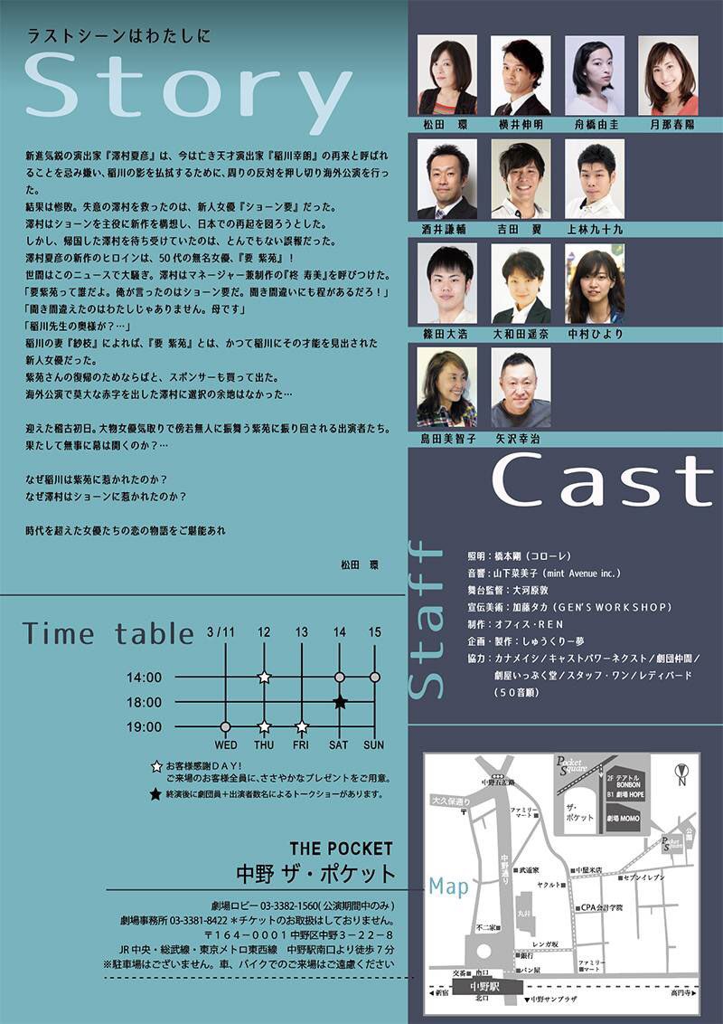 | スタッフ | 照明:橋本剛(コローレ) 音響:山下菜美子(mint Avenue inc) 舞台監督:大河原敦 宣伝美術:加藤タカ(GEN'S WORKSHOP) 制作:オフィス・REN 企画・製作:しゅうくりー夢 |