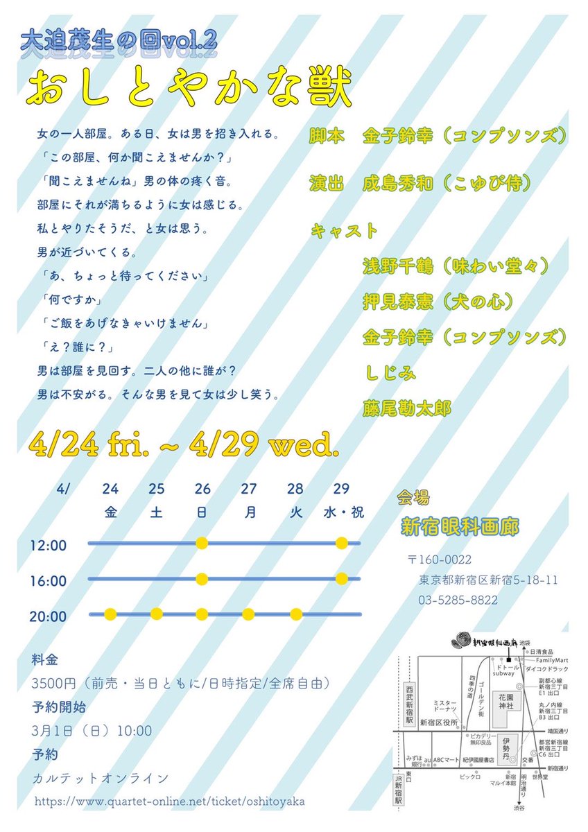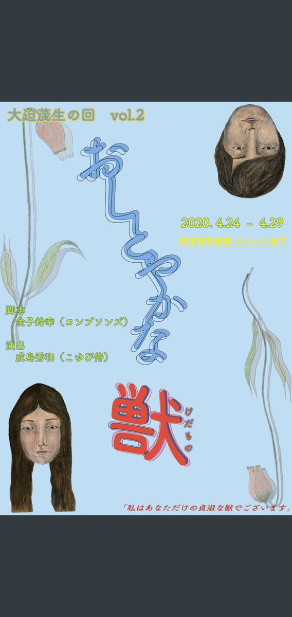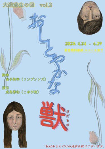 本来ならこの週末は、 出演の 大迫茂生の回 vol.2『おしとやかな獣』公演でした。無期延期とのこと、観られる日を望みつつ、今は静かに待ちます…😢 https://t.co/jnJseUA5uI https://t.co/u5iFX1hCYi #しじみさん