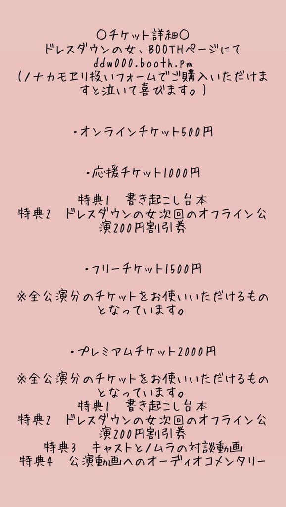 各特典はこのようになってますっ。 https://t.co/qaaiqeMBSI ・応援チケット ①書き起こし台本 ②ドレスダウンの女、次回のオフライン公演200円割引券 ・プレミアムチケット ①+②にプラ… https://t.co/2hPE1v7AjJ #ドレスダウンの女