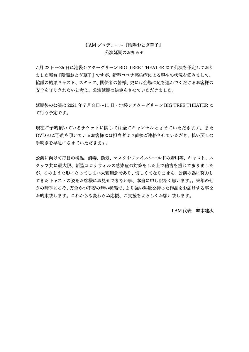 【お知らせ】 突然のご報告となり心苦しい限りです。昨今の新型コロナウイルス感染拡大の影響を受け、「陰陽おとぎ草子」2020年公演の中止が決定いたしました。同公演は2021年7月に延期して上演予定です。 公演を楽しみにしてくださって… https://t.co/J520Uqnn0F