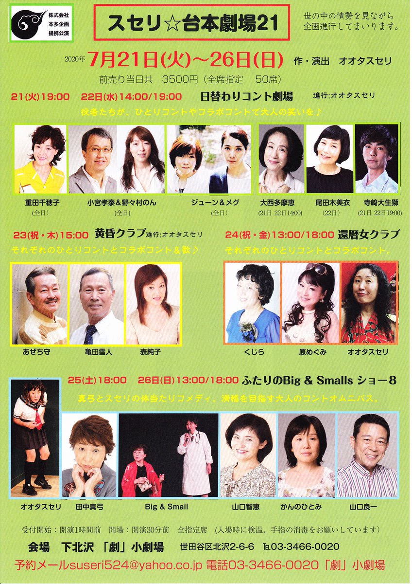 | スタッフ | 「日替わりコント劇場」 21日(火)19:00 22日(水)14:00/19:00 重田千穂子(全出演) 小宮孝泰&野々村のん(全出演) ジューン&メグ(全出演) 大西多摩恵(21日19:00 22日14:00) 尾田木美衣(22日14:00/19:00) 寺崎大生獅(21日19:00 22日19:00) 「黄昏クラブ」 23日(祝・木) あぜち守 亀田雪人 表純子 「還暦女クラブ」 24日(祝・金) くじら 原めぐみ オオタスセリ 「ふたりのBig & Smallsショー8」 25日(土)18:00 26日(日)13:00/18:00 田中真弓 オオタスセリ かんのひとみ 山口智恵 山口良一 |