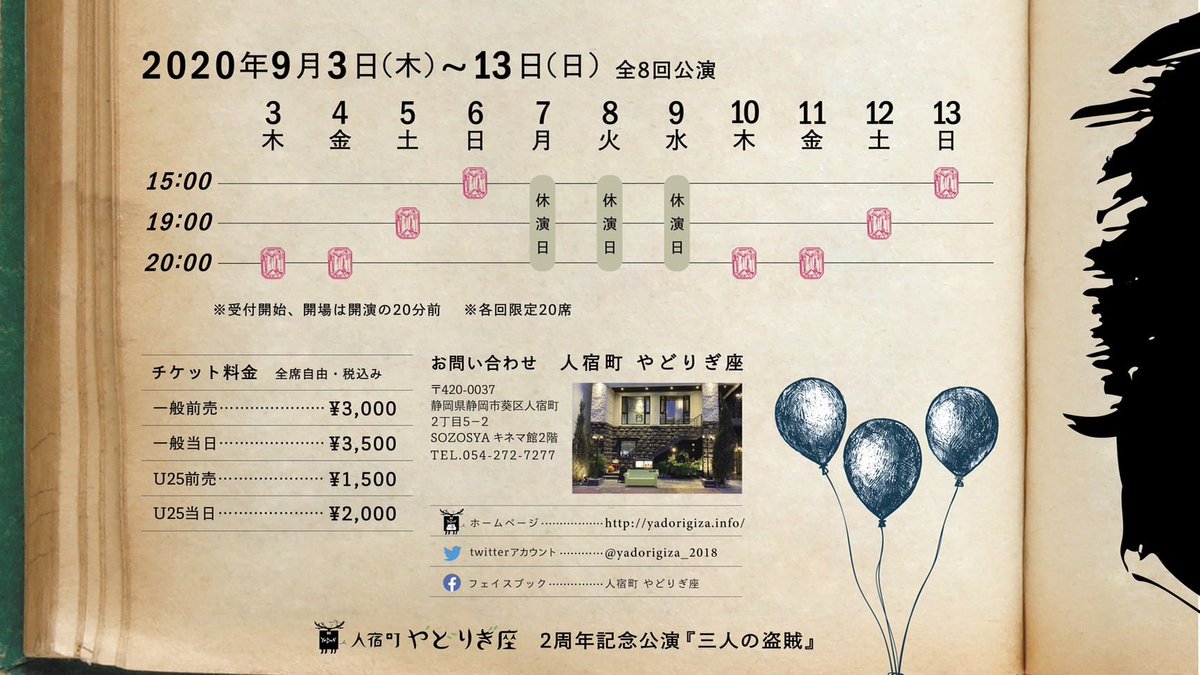 【本日初日】 人宿町やどりぎ座2周年記念公演「三人の盗賊」八木柊一郎作 9/3木20時 *上演時間2時間 *舞台から客席まで2m *各回限定20席 一般前売3,000円/当日3,500円 U25前売1,500円/当日2,000… https://t.co/PacdiCbQGy