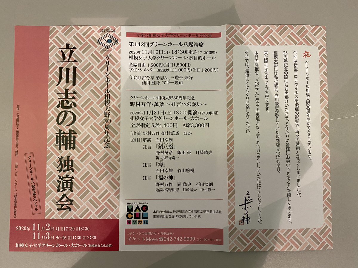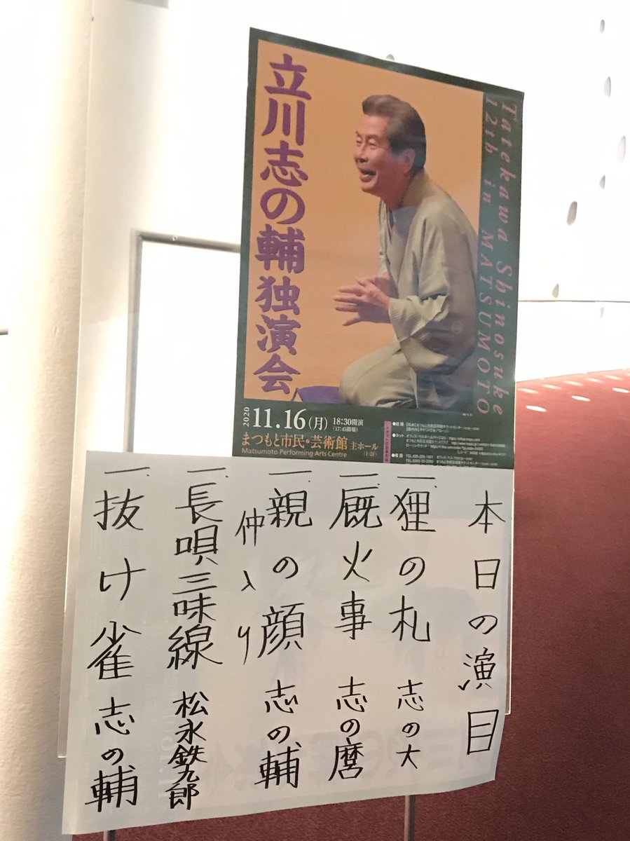 2020年11月2日 相模女子大学グリーンホール 立川志の輔独演会 開口一番 志の麿 「 」 志の輔 仲入り 長唄三味線 松永鉄九郎 「 」 志の輔 明日も同一故。一席目は最近… https://t.co/yOeYIOarex