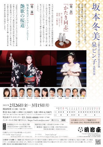 | 説明 | 第1部では泉ピン子を迎え心あたたまるお芝居を、 第2部ではヒット曲満載の華やかなオンステージをお贈りします。 第一部 『かたき同志』 作:橋田壽賀子 演出:石井ふく子 美術:中嶋正留 出演:坂本冬美 泉ピン子 京野ことみ 丹羽貞仁/三田村邦彦 ほか 第二部 坂本冬美オンステージ2021 艶歌う たの 桜道はなみち |