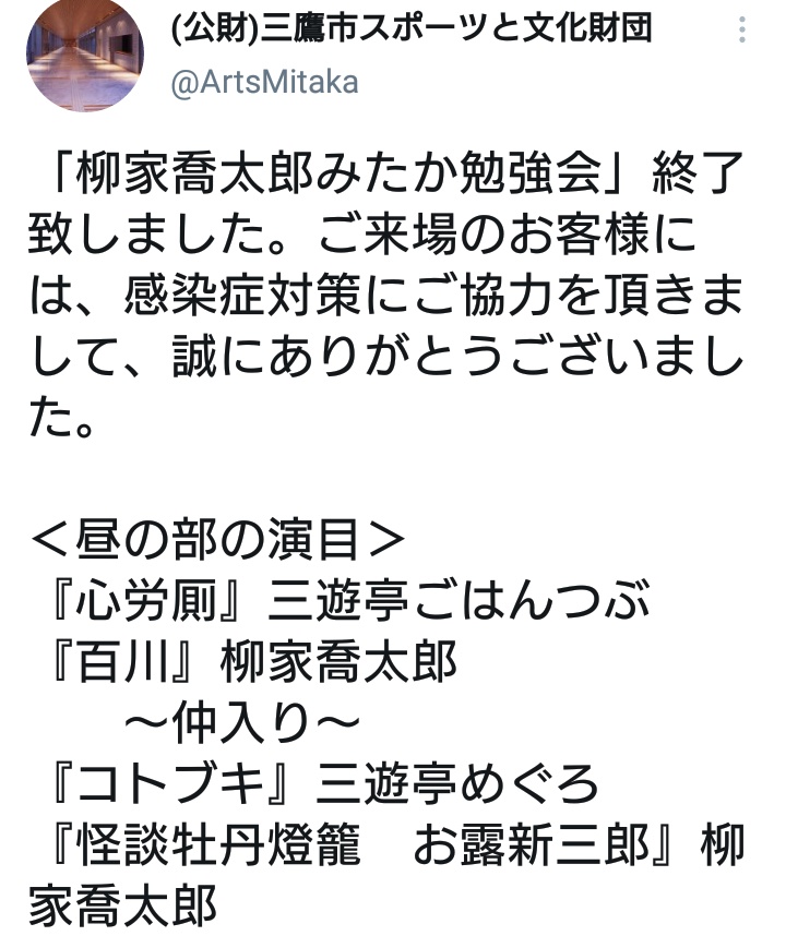 7. 「柳家喬太郎みたか勉強会」終了致しました。ご来場のお客様には、感染症対策にご協力を頂きまして、誠にありがとうございました。 <昼の部の演目> 『心労厠』三遊亭ごはんつぶ 『百川』柳家喬太郎    ~仲入り~ 『コトブキ』三遊亭め… https://t.co/ONcs97xTQv