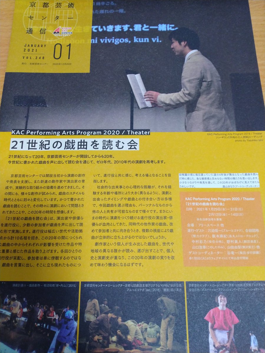 3. 【フリーペーパー】本日は【京都芸術センター通信】248をご紹介。本号ではかって書かれた戯曲を読むことで、その時々に問題にされたことや、20年間の時間を想像する『21世紀の戯曲を読む会』が興味深い。ゴーダ企画、Cosmo Proje… https://t.co/f3mWYvEpvj