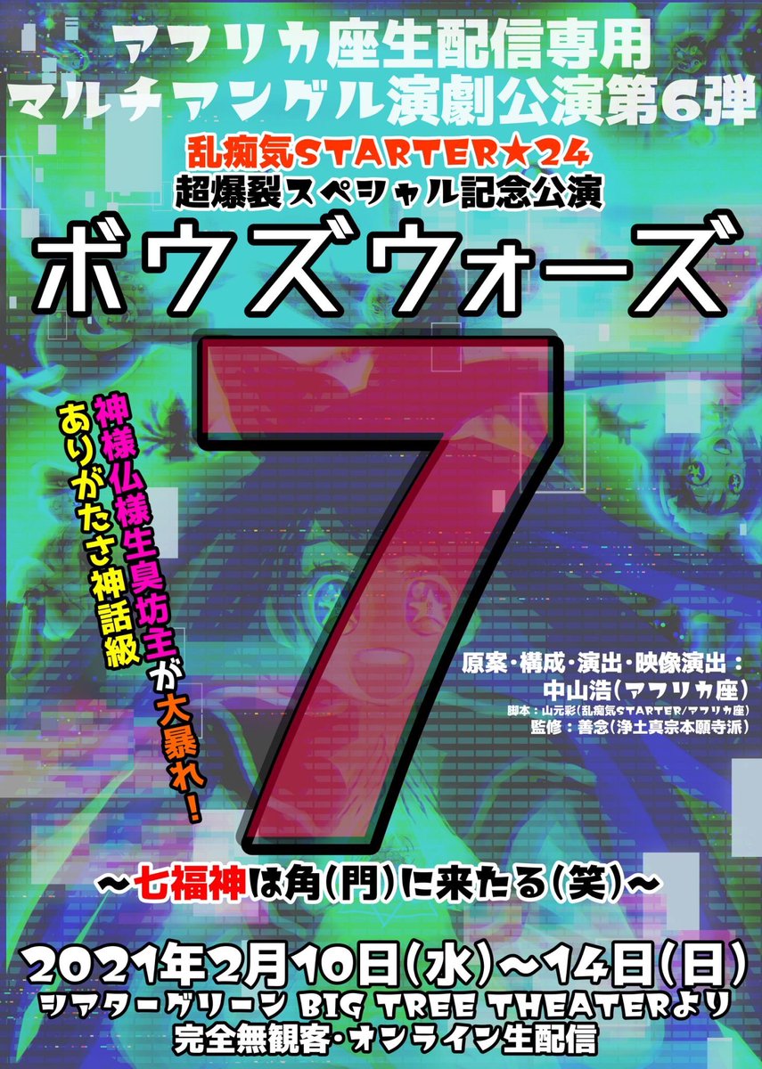 アフリカ座の生配信専用マルチアングル演劇公演第6弾 乱痴気STARTER★24 超爆裂スベシャル記念公演 『ボウズウォーズ7~七福神は門に来たる(笑)~』 ご予約いただきました皆様、誠にありがとうございます。 いよいよ明日開幕… https://t.co/rsoedfhA6z
