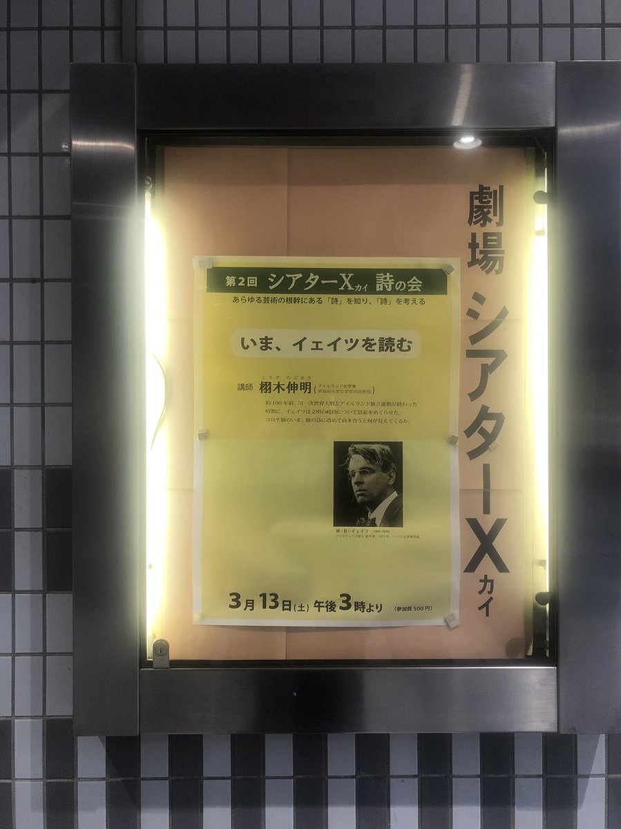 今週13日(土曜日)15時より、第2回「シアターカイ・詩のカイ」を開催します。アイルランド文学者の栩木伸明さんによる講演「いま、W・B・イェイツを読む」。会場は東京・両国のシアターカイ。お申込はシアターカイへ。 https://t.co/URunbonl56