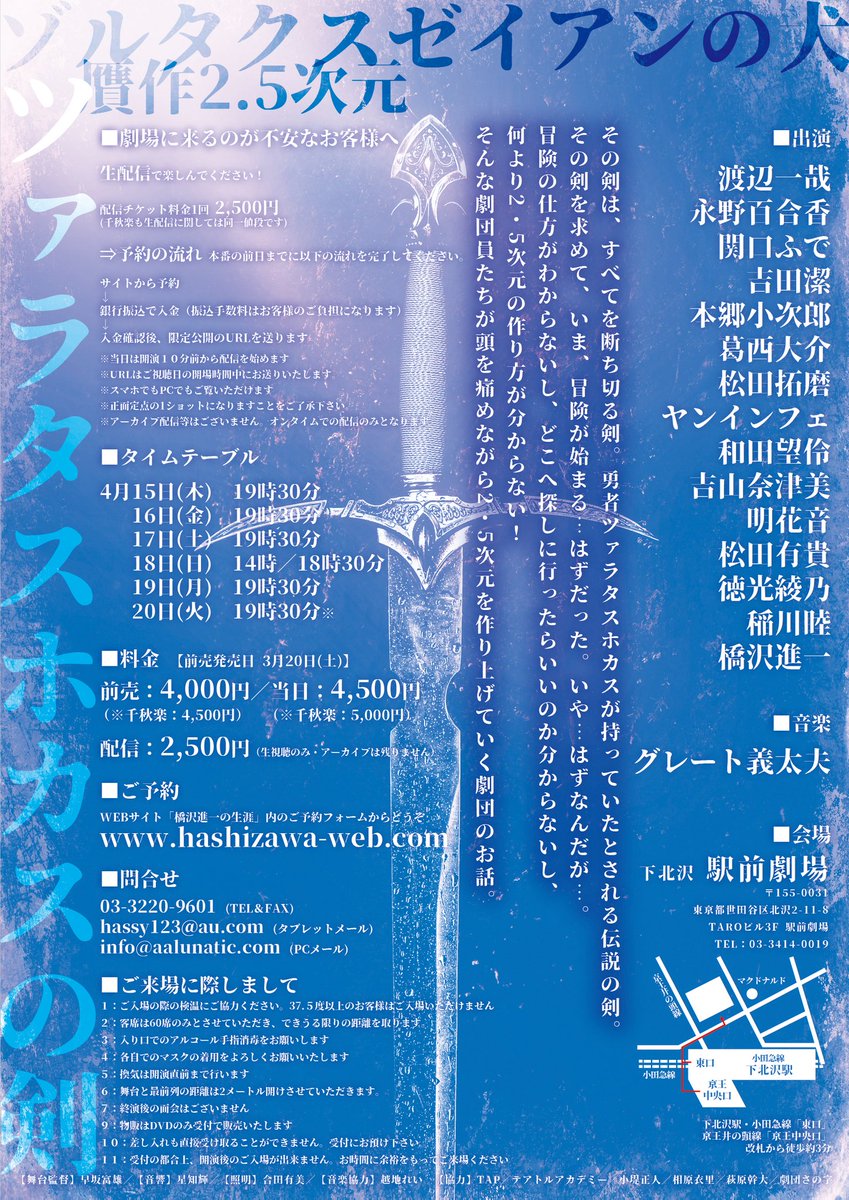 ゾルタクスゼイアンの犬公演 「贋作2.5次元『ツァラタスホカスの剣』」本日、三日目です。 19:00開場、19:30開演 下北沢駅前劇場にて。 本日も飛び込み大歓迎でお待ちしております。 2.5次元が何なのかもよく分かってない劇… https://t.co/M8dtSqWaet
