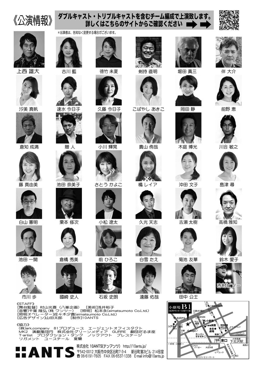 | 出演 | 上西雄大、古川藍、徳竹未夏、堀田眞三、伴大介、池田一開、池田奈美子、石坂史朗、市川歩、遠藤佑哉、岡田静、小川輝晃、沖田文子、川合敏之、菊池友華、木庭博光、贈人、久藤今日子、國崎史人、倉知成満、倉橋秀美、栗本修次、剣持直明、古瀬太樹、こばやしあきこ、小松遼太、さとうかよこ、汐見真帆、島津尋、白山憲明、白雪たえ、鈴木愛子、高橋雅知、貴山侑哉、橘レイア、田中公士、速水今日子、久光天志、藤真由美、前ひろこ、前野恵、吉村ビソー |