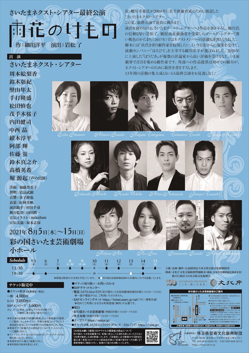 さいたまネクスト・シアター 「雨花のけもの」終演致しました。 岩松さん、さいたま芸術劇場さん、スタッフさん、観に来てくださった皆さん、本当にありがとうございました。 無事に完走しました。 ネクスト・シアターのみんなの出会えて良か… https://t.co/qxWGIVLmeh