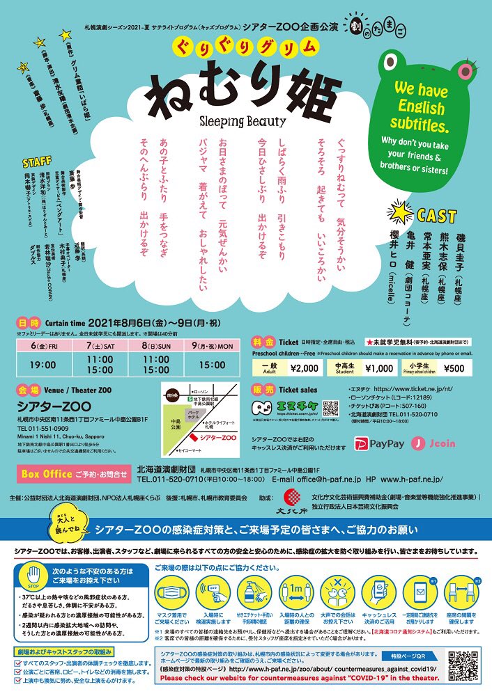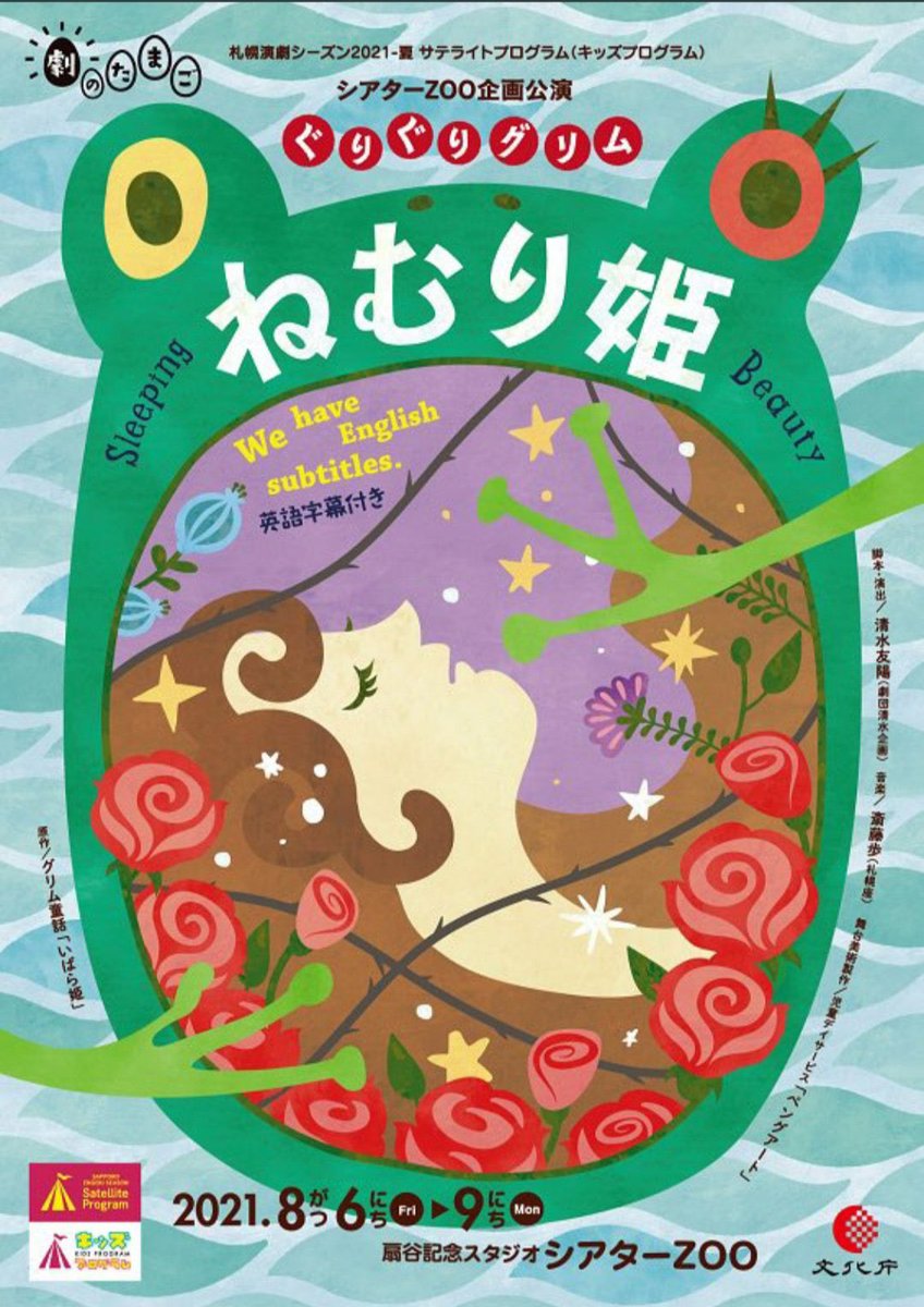 | スタッフ | 作者 原作:グリム童話「いばら姫」 舞台美術デザイン・舞台監督:斎藤歩 舞台美術製作:児童デイサービス「ペングアート」 照明プラン:清水洋和(ほりぞんとあーと) 衣裳デザイン:岡本嚇子(アトリエ・スピカ) 翻訳:近藤学 字幕オペレーター:木村典子 宣伝美術:若林瑞沙(Studio COPAIN) 主催:北海道演劇財団・札幌座くらぶ 後援:札幌市、札幌市教育委員会 助成:文化庁文化芸術振興費補助金(劇場・音楽堂等機能強化推進事業)|独立行政法人日本芸術文化振興会 企画制作:北海道演劇財団 |