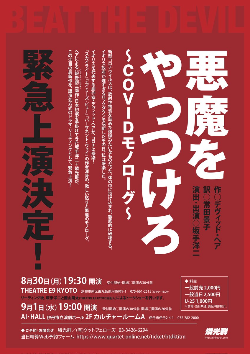 劇団燐光群による、劇作家ディビッド・ヘアの「BEAT THE DEVIL悪魔をやっつけろ〜 COVIDモノローグ〜」が9月13、14日、高円寺で追加緊急上演されます。主宰坂手洋二さんによるリーディング方式。終演後トークに不肖ワタク… https://t.co/fz0HsVUS5o