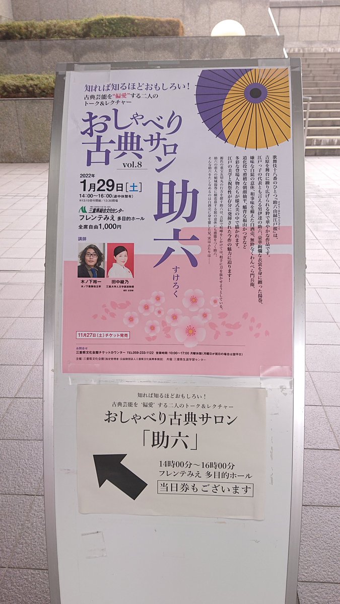 【2022/01/29土 14:00-】[三重県/津]三重県文化会館▽知れば知るほどおもしろい!古典芸能を‘偏愛’する二人のトーク&レクチャー「おしゃべり古典サロンvol.8「助六」」▽ 約120分▽https://t.co/rjgPtNwU7B(本日のみ) #上演時間