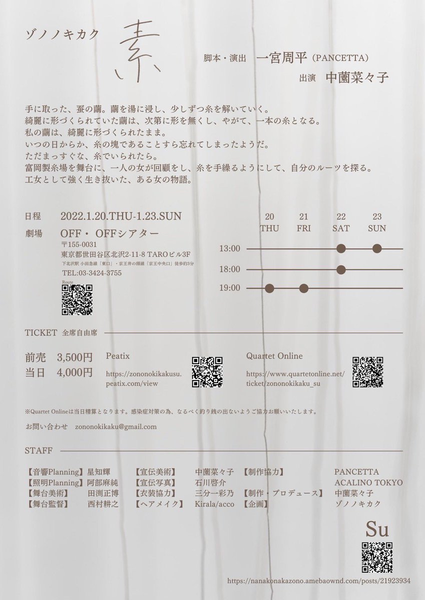 ゾノノキカク『素』 1/22(土)13時開演 受付開始は開演の45分前 開場は開演の30分前です。 当日券もございます。 ご来場を心よりお待ちしております! https://t.co/TwMLqiRJUL