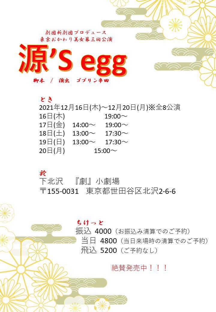🐣日程:2021年12月16日(木)〜20日(月) 🐣劇場:「劇」小 東京おかわり美女 第3回公演「源's egg」に出演させて頂きます!! ぜひご予約お待ちしてます! https://t.co/GPaWUb99wo