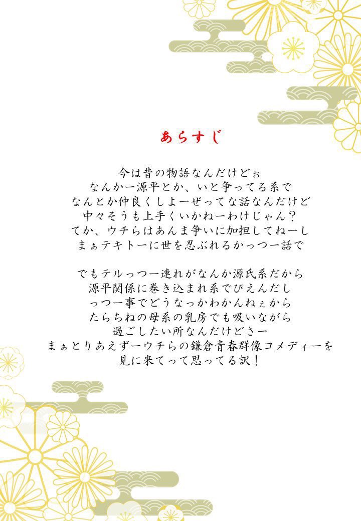 | 説明 | 今は昔の話なんだけどぉ なんかー源平とか、いと争ってる系で なんとか仲良くしよーぜってな話なんだけど 中々そうも上手くいかねーわけじゃん? てか、ウチらはあんま争いに加担してねーし まぁテキトーに世を忍ぶれるかっつー話で でもテルっつー連れがなんか源氏系だから 源平関係に巻き込まれでぴえんだし っつー事でどうなっかわかんねぇから たらちねの母系の乳房でも吸いながら 過ごしたい所なんだけどさー まぁとりあえずーウチらの鎌倉青春群像コメディを 見に来てって思ってる訳! |