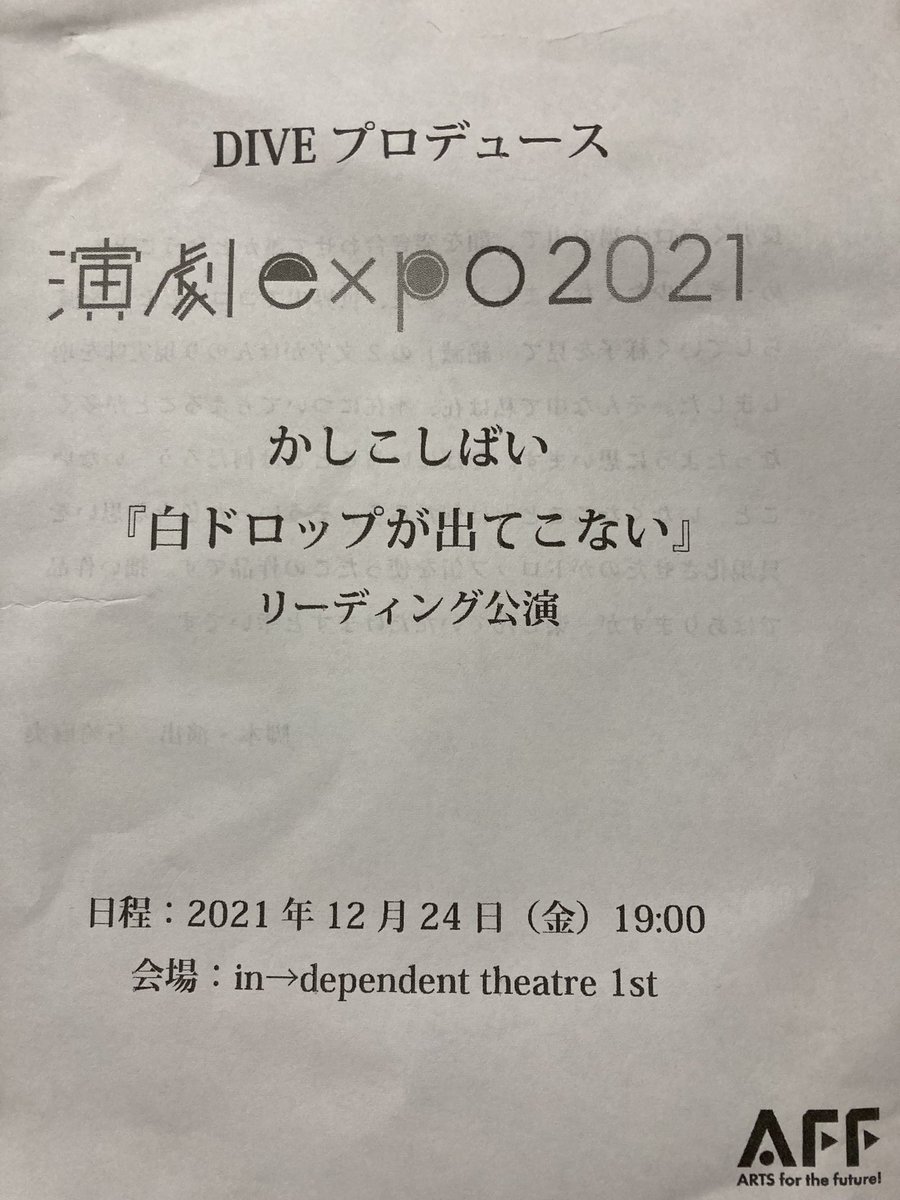 【演劇EXPO2021】 かしこしばい「白ドロップが出てこない」が終演🎉 ご来場いただいた皆さま、ありがとうございました🎄 明日25日は18時から、遊劇舞台二月病×三角フラスコ『コップの底の太陽』& 小原延之×土橋淳志×石田麻… https://t.co/cvX6hH2Q2C