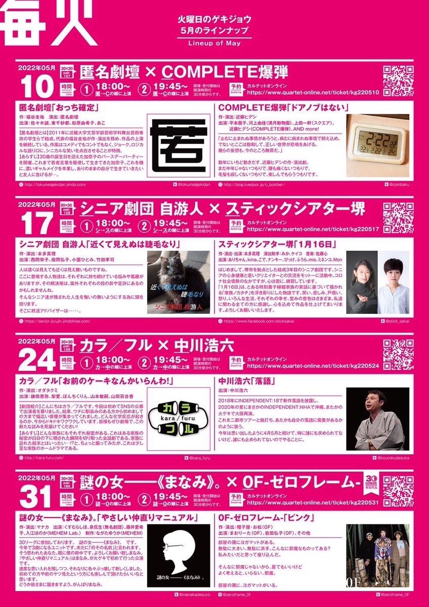 【火曜日のゲキジョウ】とは? 30分以内の舞台作品を 二団体が順に上演する 毎週火曜日の夜のお楽しみ! 5/10(火)の夜は、 【匿名劇壇】と【COMPLETE爆弾】 が揃い踏み!! インディペンデントシアター1stにて 皆… https://t.co/4K8K7REj26