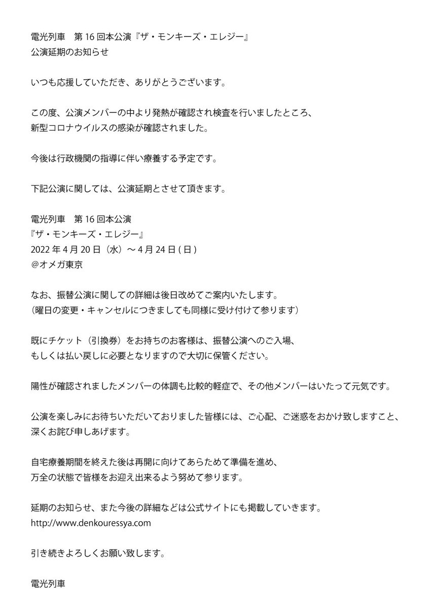 電光列車第16回本公演『ザ・モンキーズ・エレジー』、公演延期になりましたのでお知らせさせていただきます。 観ていただく時期が先になってしまいますが、必ずお届けできる日が来ますので続報お待ちいただけると嬉しいです🙇 私も元気ですが、… https://t.co/hPtDViZinW