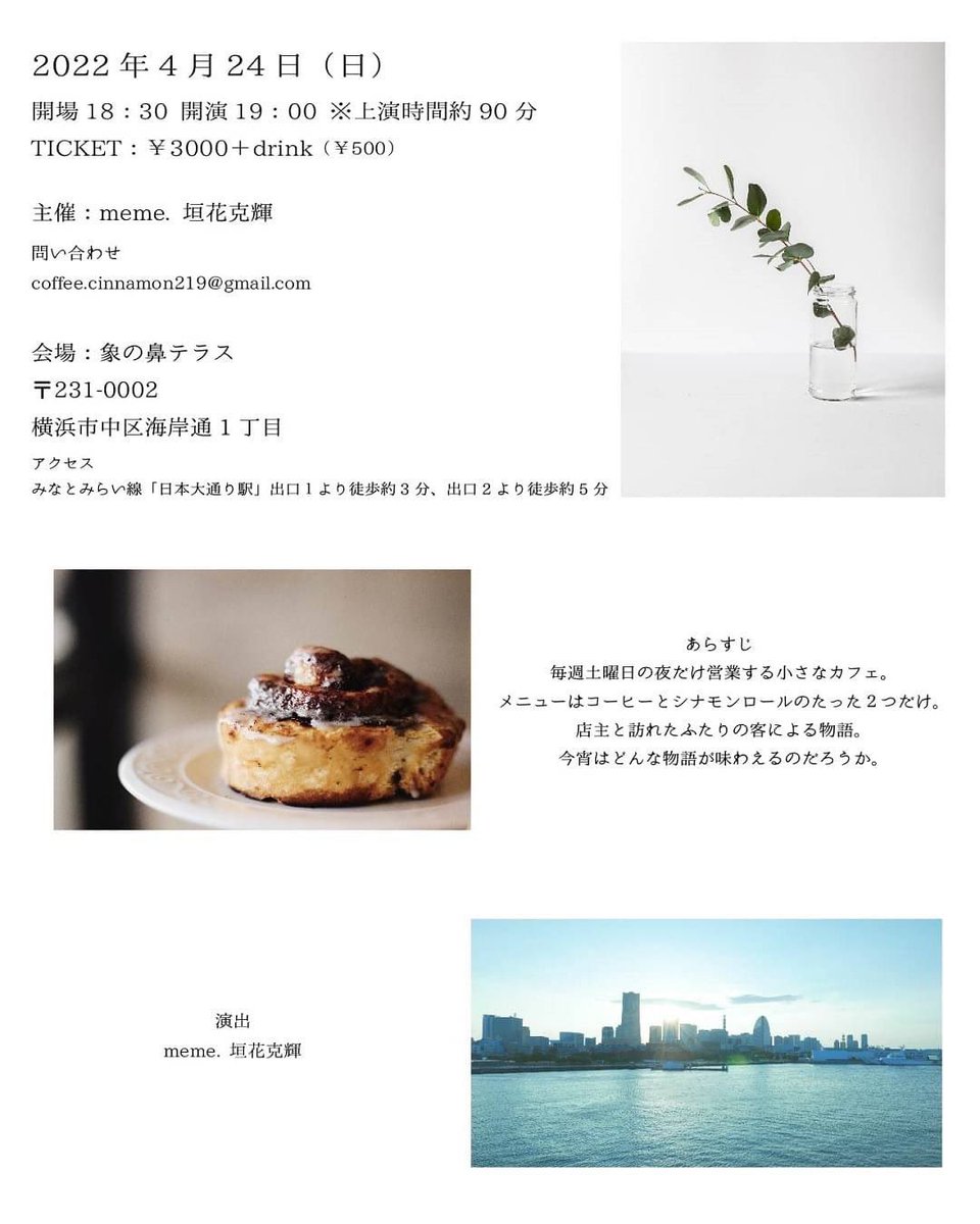 3. いよいよ本日です🏖🐠 2月から延期していて やっとこの日を迎えます。 「コーヒーと。シナモンロールと。」 2022.04.24㈰ 18:30 開場 19:00 開演 @ZOUNOHANA_TRC みなさまよろしくお願い… https://t.co/vlwtvY6MLA