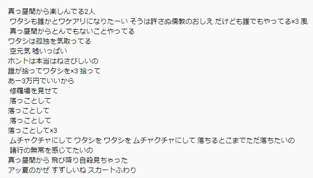 真っ昼間から 飛び降り自殺 見ちゃった アッ夏のかぜ すずしいね スカートふわり