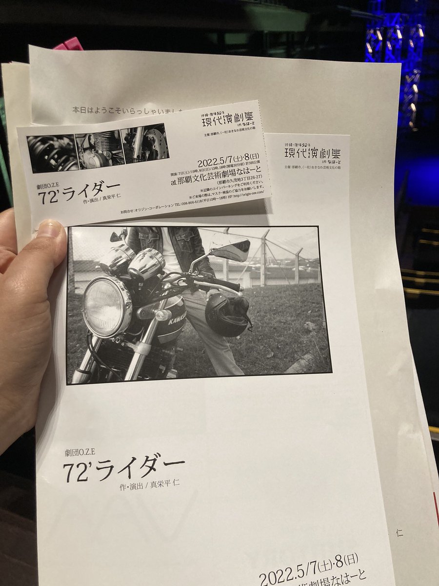 劇団O.Z.E 『72'ライダー』を観に来ました。 最近は裏方で劇団を支えて来た 平安信行 さんを久し振りに舞台で観られると思うとドキドキします。 10年前にも観た『72'ライダー』。本土復帰50周年の節目での再演に意味がありま… https://t.co/x5eiUpOv4y