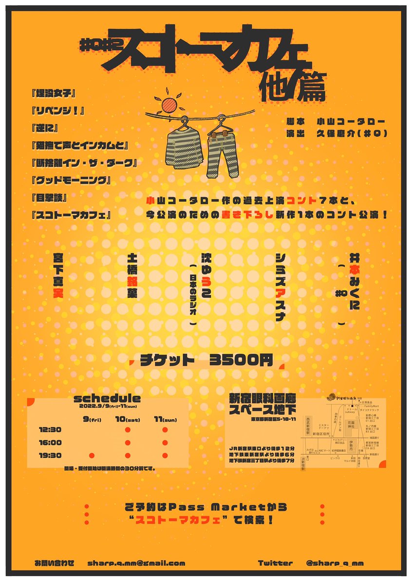 【映像販売決定!】 スコトーマカフェ他7篇の映像の販売が決定いたしました! 価格は2000円で、公演のコント部分のみの抜粋となります。 販売時期は未定ですが、公演終了から1週間程度でご用意できるかと思います。 続報をお待ちください!