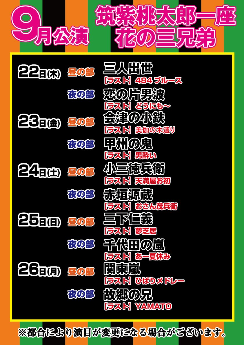 支配(される)人の日常 《2022年9月公演》 [黒崎新劇座] 総座長 【予定演目の追加】 ■23日 芝居『板前兄弟』 ■24日 〈未来祭り〉 芝居『花笠文治』 [昼の部] ミニショー『… https://t.co/VB8PDjerpC #長谷川武弥劇団 #愛京花