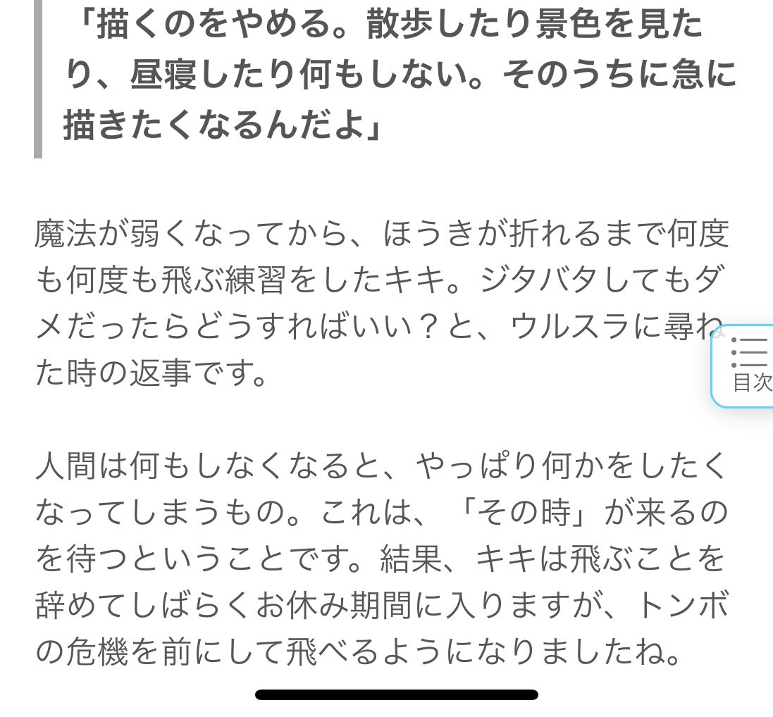 キキ 「ワタシ、前は何も考えなくても飛べたの。 でも今はどうやって飛べたのかわからなくなっちゃった。」 ウルスラ 「そういう時はジタバタするしかないよ。 描いて、描いて、描きまくる!」