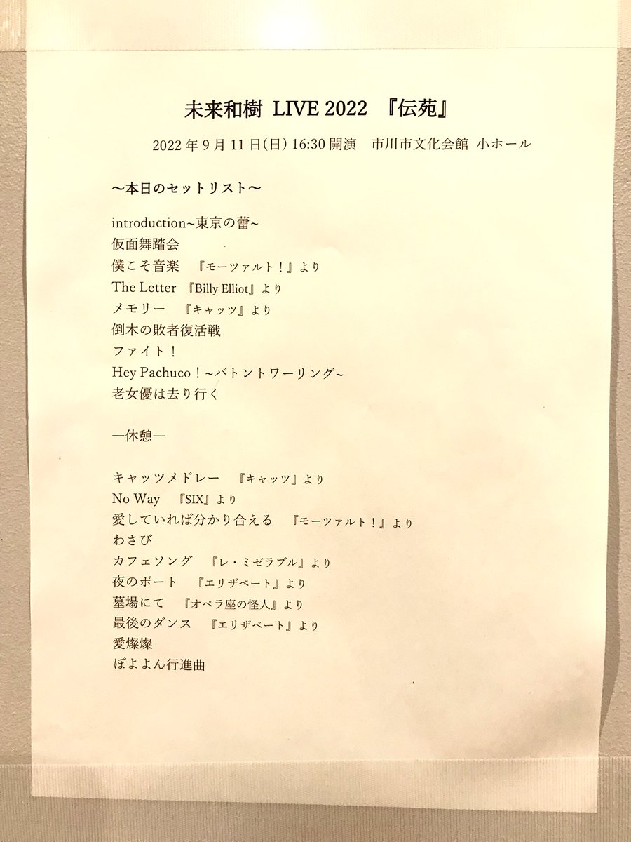 未来和樹 LIVE 2022 『伝苑』 全3公演、滞りなく終演しました。 怒涛の1ヶ月でした。 今はただ、無事に終えられたことにホッとし、放心しています。 また改めて、振り返りのツイートをしますね! ご来場くださったみなさま、本当… https://t.co/5igasoONrO