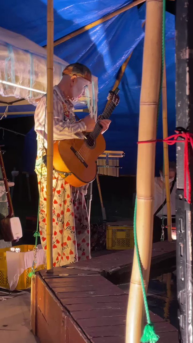客席には雨対策の屋根。投げ銭を折り紙に包んでスタンバイ。追加の折り紙もゆらゆら。 クラゲとウミガメの愛しく切ない海辺の恋物語。くるくる回る水上回り舞台の上で、… https://t.co/hzYvc3BzTG #野外劇団楽市楽座 #ゆりあげ