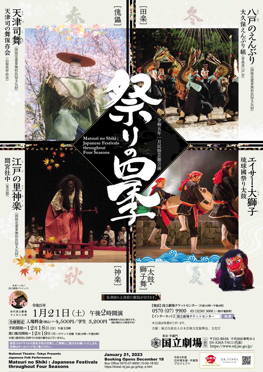 | スタッフ | 未来へつなぐ国立劇場プロジェクト 初代国立劇場さよなら公演 祭りの四季 [冬]<田楽> 八戸(はちのへ)のえんぶり(国指定重要無形民俗文化財) 大久保えんぶり組(青森県八戸市) [春]<傀儡> 天津司舞(てんづしまい)(国指定重要無形民俗文化財) 天津司の舞保存会(山梨県甲府市) [夏]<太鼓・獅子舞> エイサー・大獅子(うふしし) 琉球國祭り太鼓 [秋]<神楽> 江戸の里神楽(えどのさとかぐら)(国指定重要無形民俗文化財) 間宮社中(東京都) 令和4年度日本博主催・共催型プロジェクト 主催=独立行政法人日本芸術文化振興会、文化庁 |
