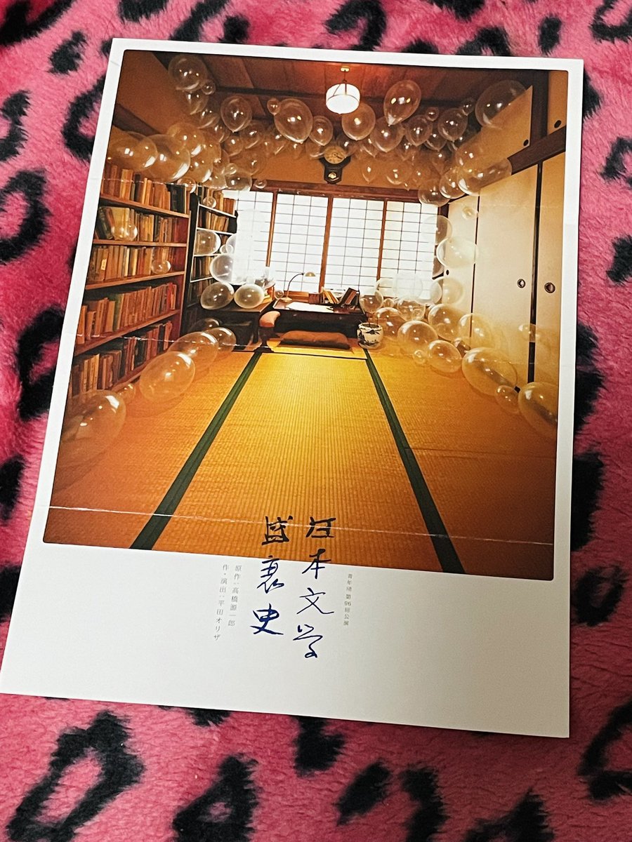 青年団第96回公演『日本文学盛衰史』(@seinendan_org)のチラシ。 座布団の上に人がいるか、いないか、いたのか?畳を囲む透明な風船をどう捉えるか、話が盛り上がりました。 吉祥寺シアター併設のカフェ、吉祥なおきちさんでコ… https://t.co/8ncHbee4ti